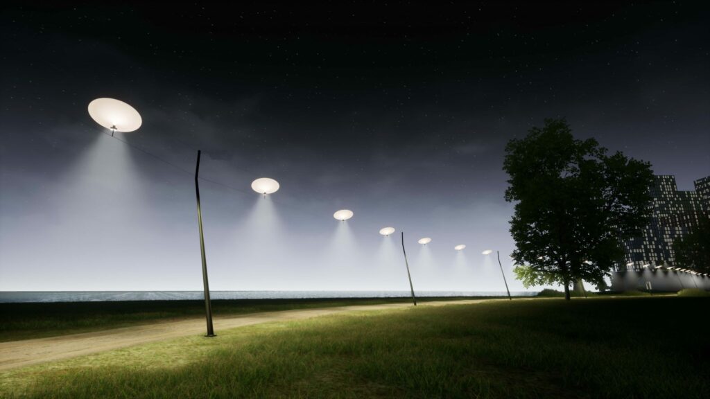 Lampy są wyposażone w szereg sensorów wrażliwych na światło, które są odpowiedzialne za znajdowanie najlepszej pozycji do pobierania energii słonecznej. Szereg lamp powieszonych wzdłuż trasy w wizualny sposób łączy ze sobą punkt A i B. Światło latarni, niczym przewodnik, prowadzi przechodniów przez ciemną noc. Siła zamontowanych żarówek LED wynosi: 321 lumenów (2W), 486 lumenów (3W) i 682 lumeny (4.5W). Lampy są zawieszone na wysokości 5.2 m a odległość między nimi wynosi około 10 m.